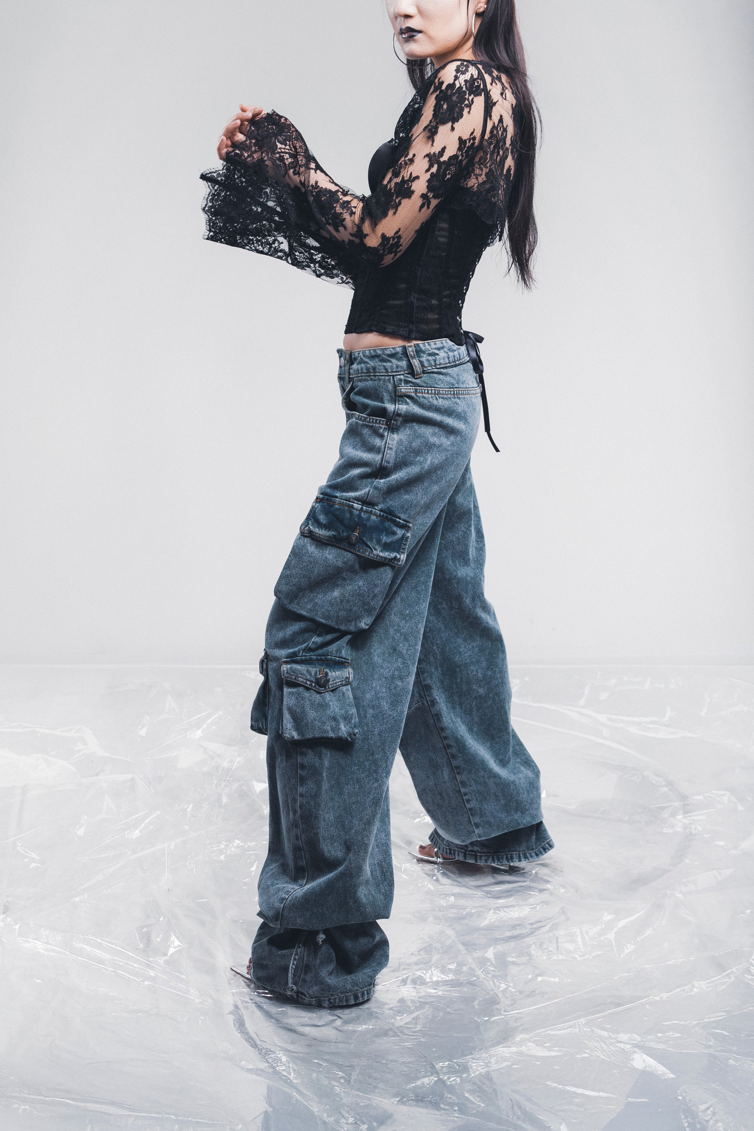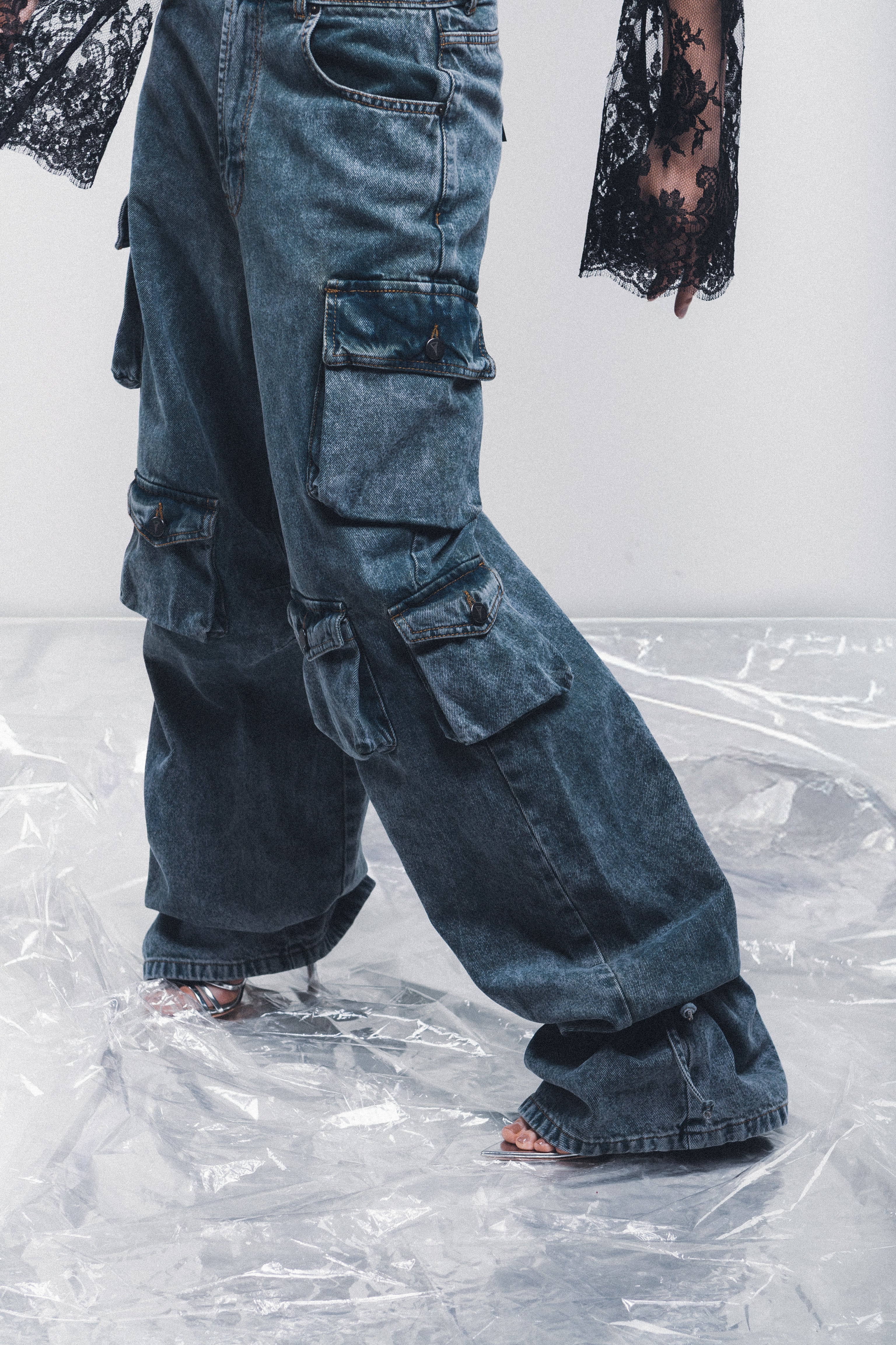 Pantaloni in tessuto denim multitasche effetto marmorizzato. Laccetti integrati alla caviglia.