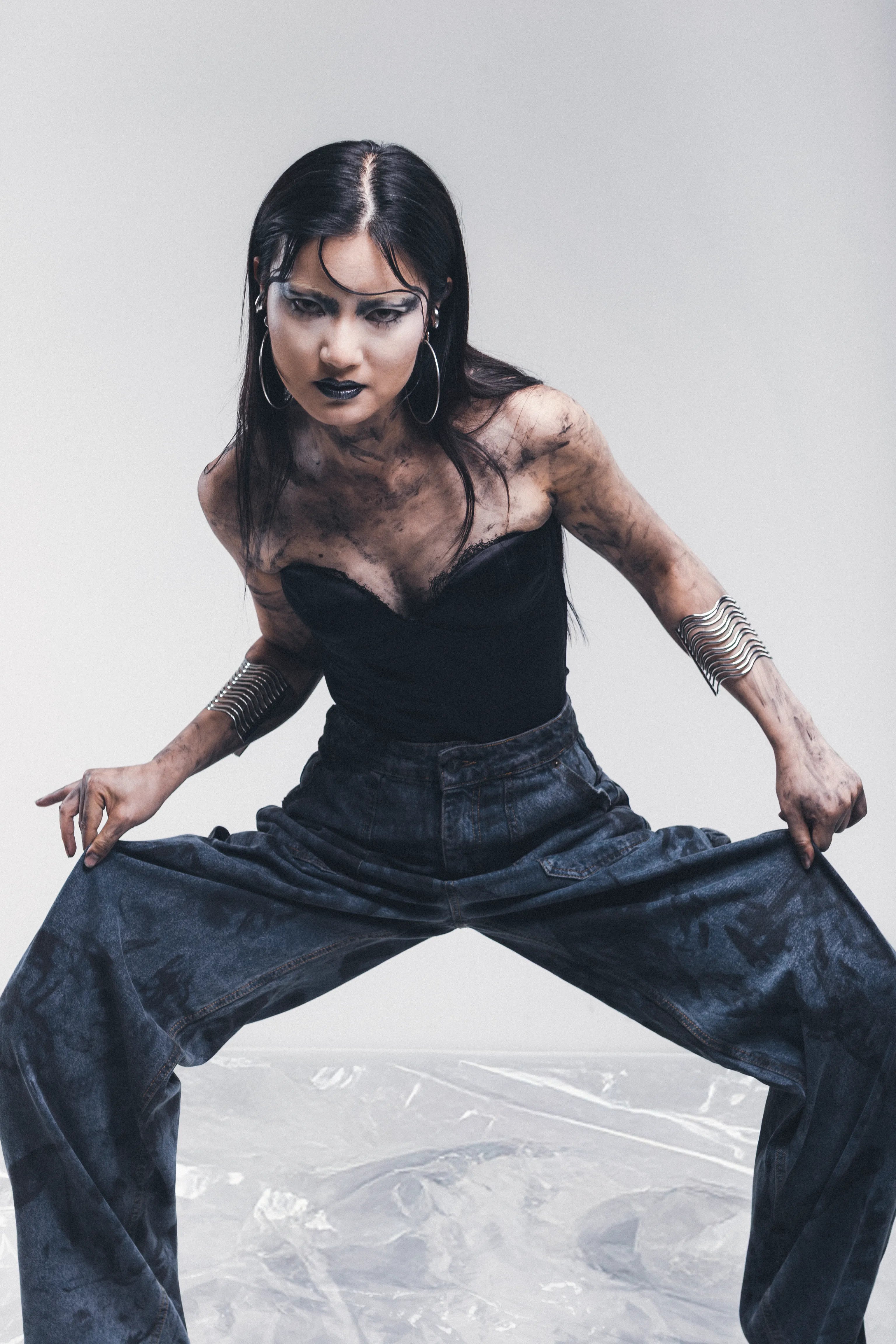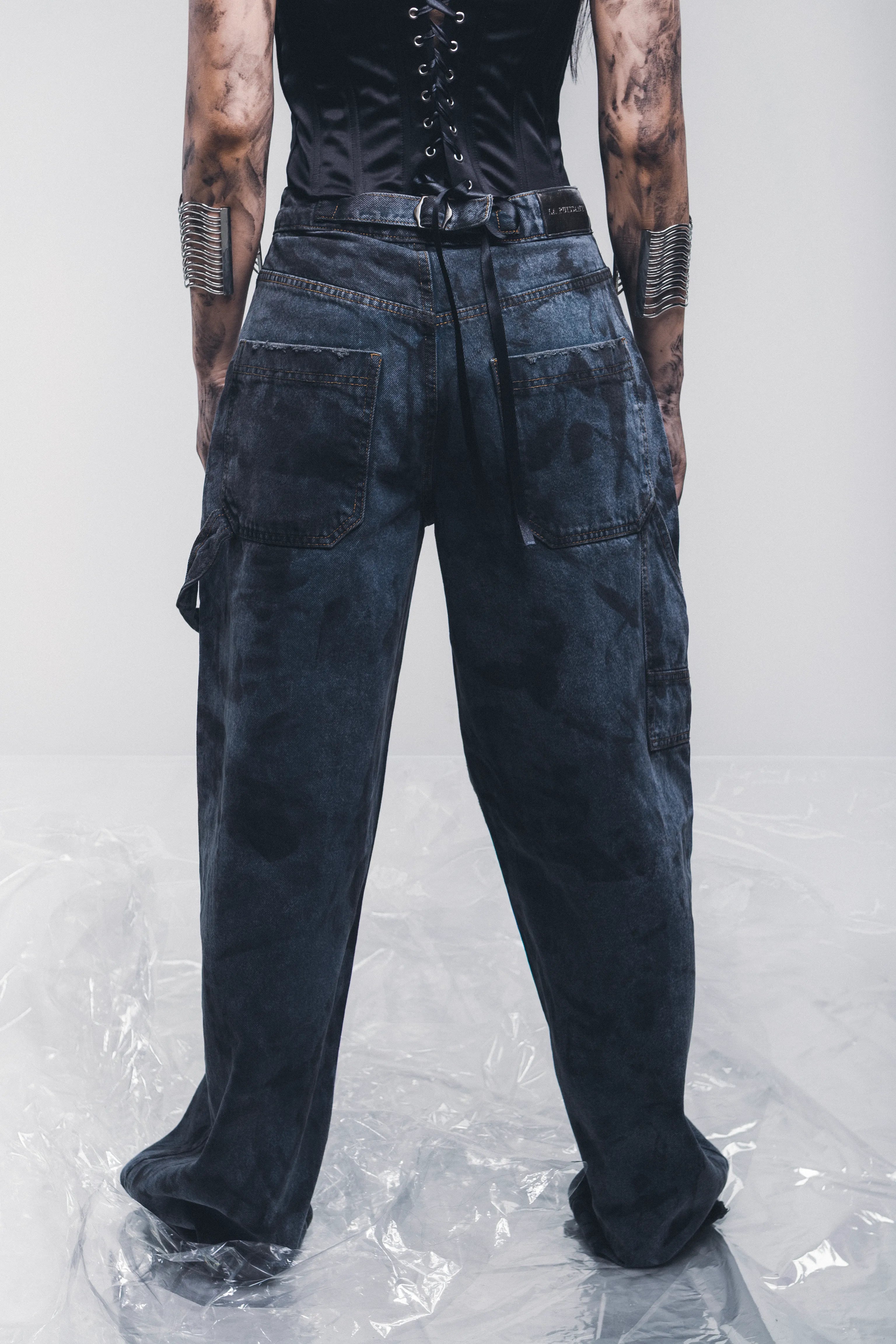 Pantaloni in tessuto denim modello Carpenter effetto floccato con stampa realizzati a mano effetto meccanoflage. Edizione limitata.