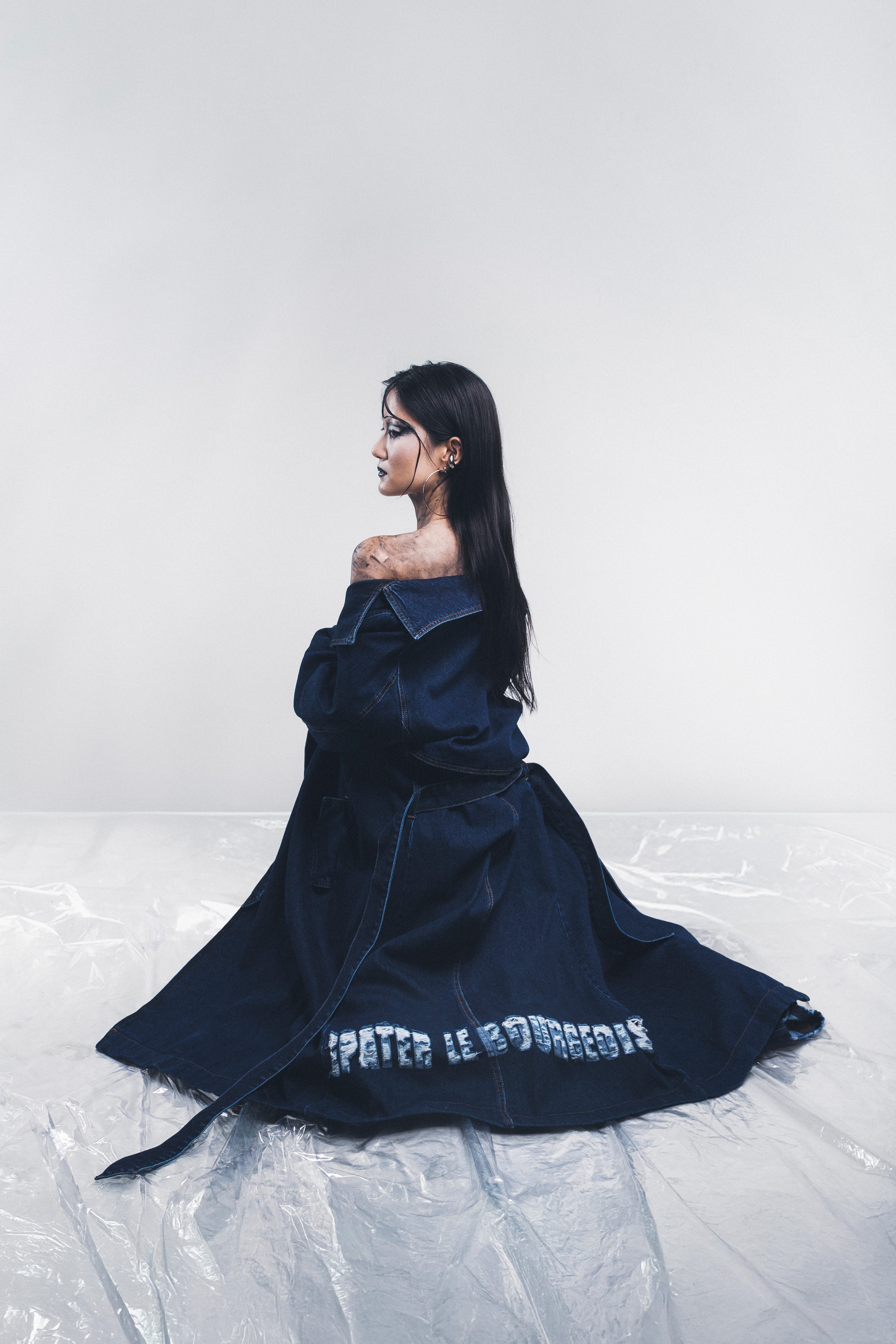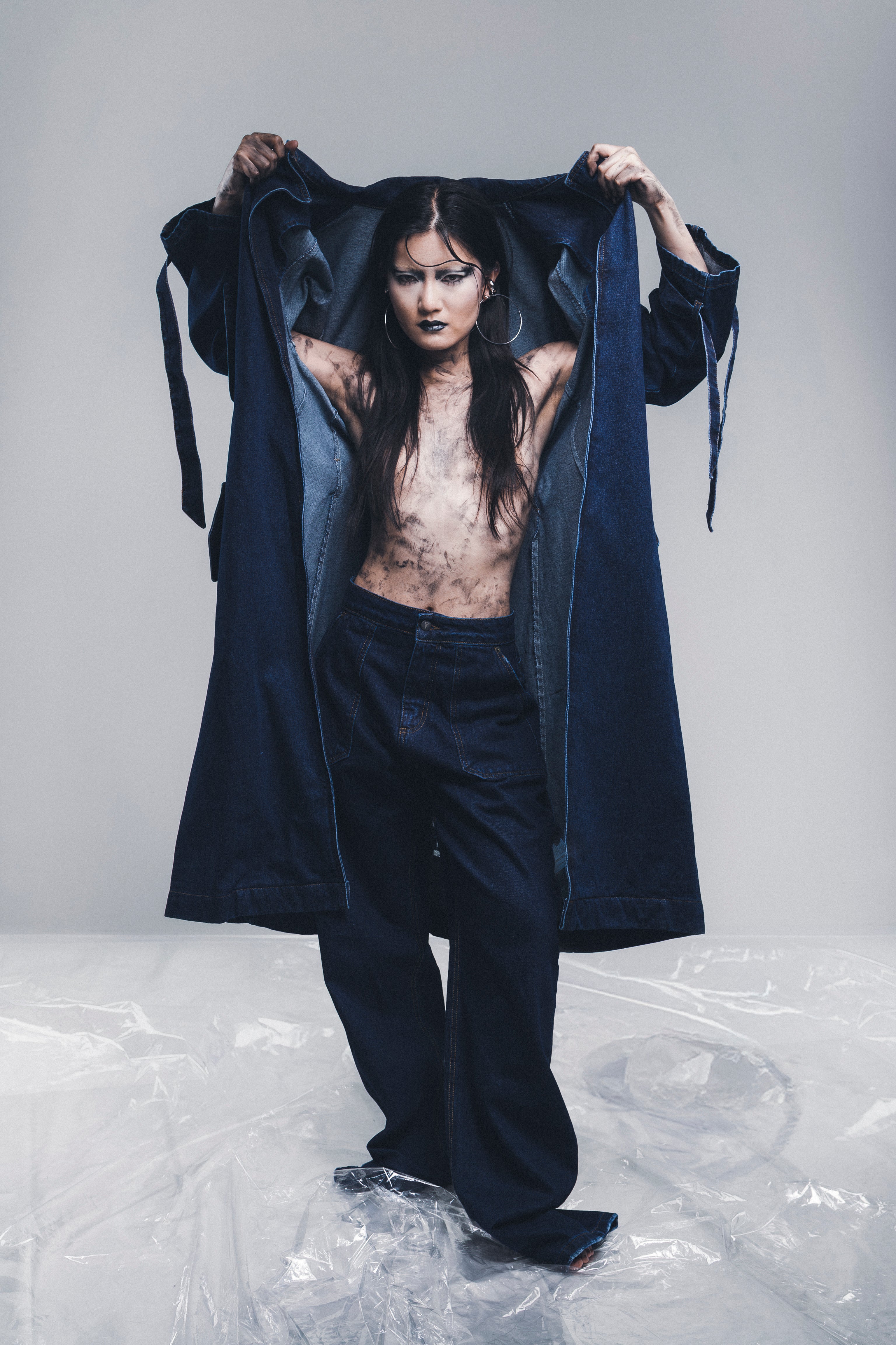 Trench lungo in 100% denim lavaggio scuro con patta frangivento e chiusura con cinta. Cinte integrate removibili e regolabili sulle maniche. Abrasione "Epater le bourgeois" all' estremità posteriore. Prodotto su ordinazione.